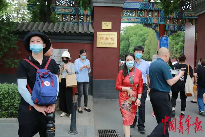 6月7日上午,北京市东城区,一名身穿红旗袍的家长走出雍和宫。中青报•中青网记者 曲俊燕/摄