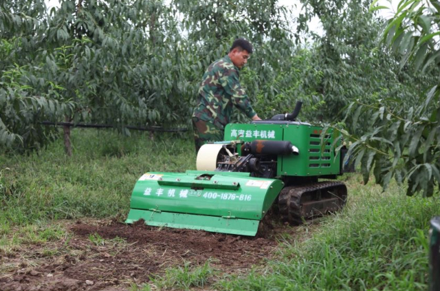 传统果园行距4米株距4米一亩地38棵,原来果农怕树劈叉,就要用竹竿撑起来,遍地是竹竿进不了农业机械。国桃基地研究了倒拉枝技术,在树中间立个杆子,用绳子拉着树枝,起到了同样的作用,再配合修剪,小拖拉机就可以携带除草机等配件进入果园了。
