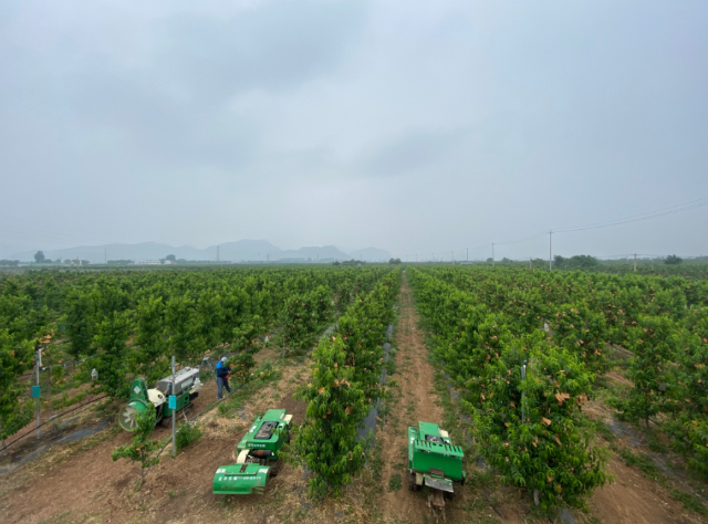 与传统桃园相比,国桃基地的桃树枝杈并不凌乱,且树木间距大。这是出于农业机械进桃园的需求。