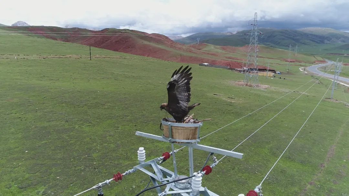 (在青海三江源地区,国家电网青海公司搭建的人工鸟巢内,不少鸟类筑巢安家)