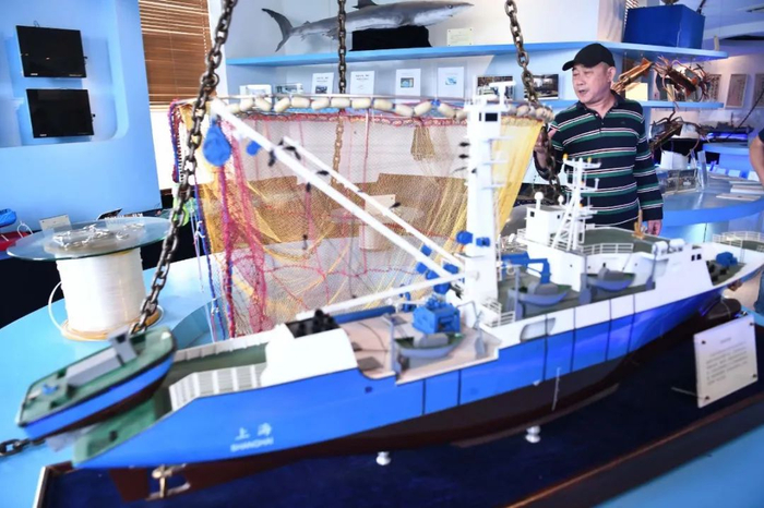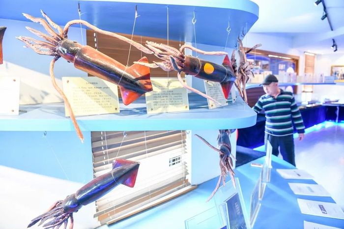 捕鱿鱼,可是个技术活儿。新民晚报记者跟随该校海洋科学学院教师王大弟走进了科普展厅。“鱿鱼捕捞量有着一定的规律性,一般来说高产年会持续2-4年左右,低产年会持续2-4年左右。高产年和低产年通常交替出现。”他说。他指着一艘远洋鱿钓渔船介绍,我国从1996年开始自行设计和建造大型专业鱿钓船,这类渔船资源破坏性较小。还有一种大型拖网渔船,“火力全开”——大鱼小鱼都捕,商业价值不高,还会破坏海底的生态环境。