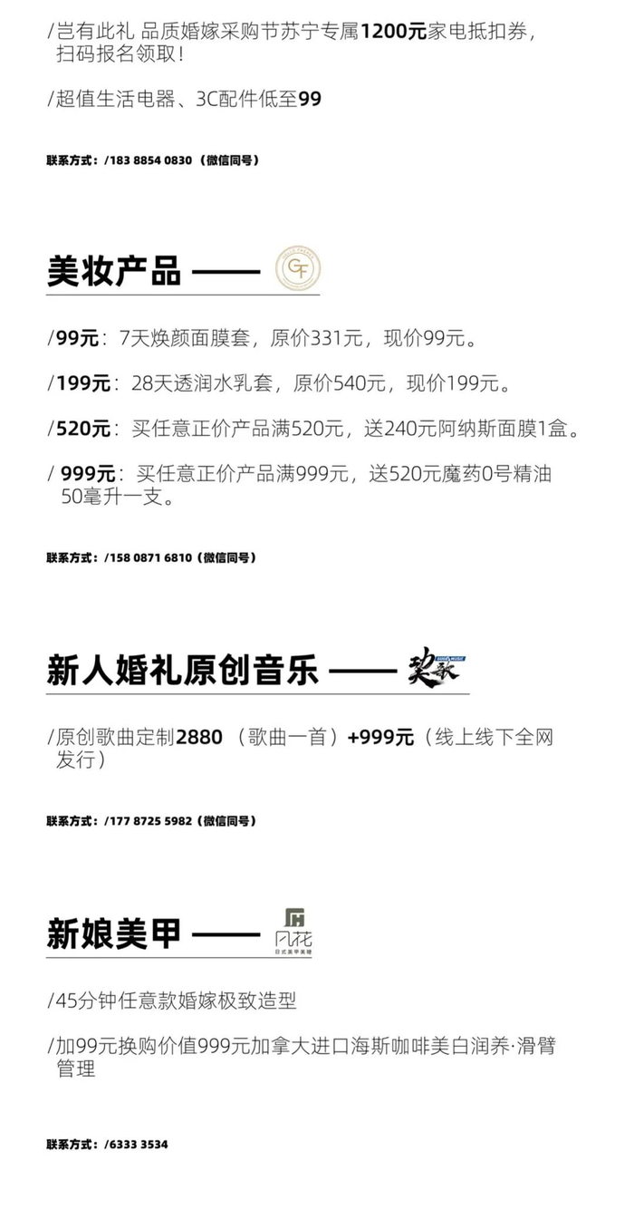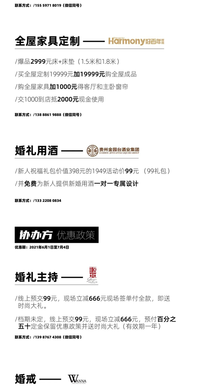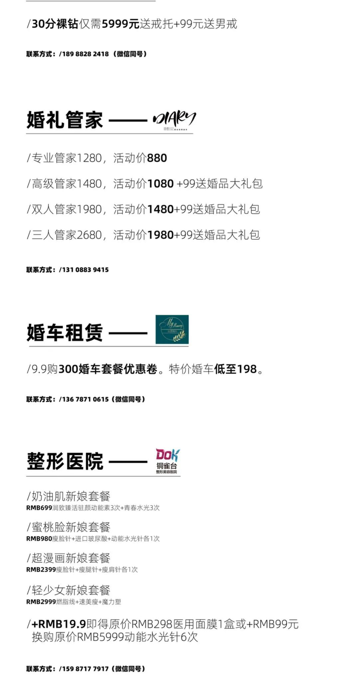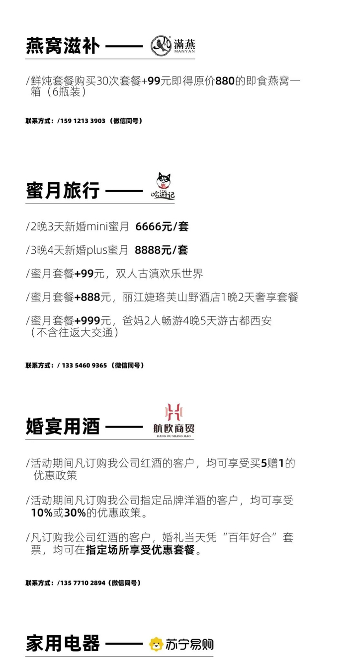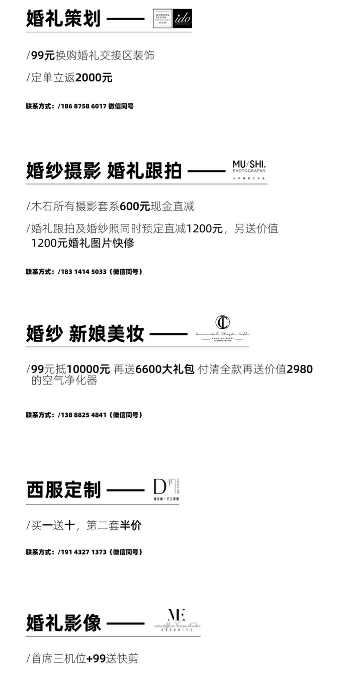 婚宴酒店 / 婚纱摄影 / 婚礼策划 / 婚礼跟拍 / 婚礼主持 / 婚礼管家 / 婚礼摄影 / 婚礼影像 / 婚纱礼服 / 西服定制 / 新娘美妆 / 婚车租赁 / 婚礼用酒 / 婚戒 / 新娘美甲 / 新房家具定制 / 新房电器 / 蜜月旅行 / 新人婚礼原创音乐 / 新娘护肤 / 新娘美容 / 燕窝滋补 等.......
