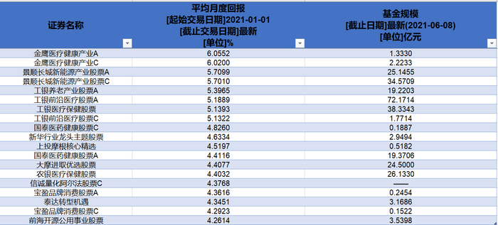 今年以来,截至6月8日收盘,在主动权益类基金中的普通股票型基金月度回报前20名中,宝盈品牌消费股票C、宝盈品牌消费股票A、上投摩根核心精选、国泰医药健康股票C这四只基金规模不足1亿元,属于绝对意义上的“迷你基金”。