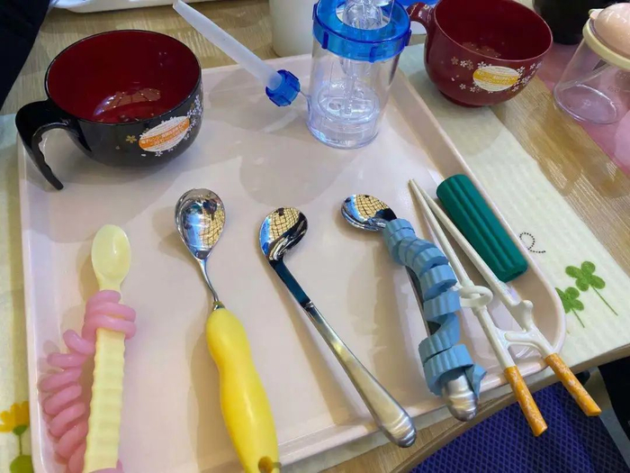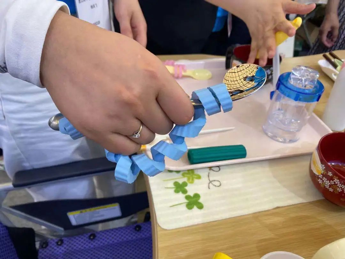 “随着年龄渐长,老年人的肌肉会退化,手部没有力气。特别是一些患有疾病的老人,可能很难控制自己的手部动作,因此我们设计了专门的老年人餐具。”