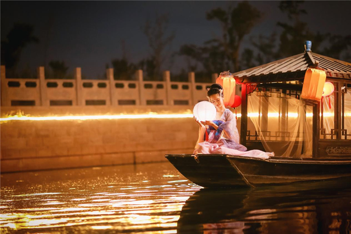 正值端午假期,一袭唐装亮相,走在运河古镇的街道上,浓厚的古风气息扑面而来。白天逛逛草市,仿佛穿越回隋唐时期的民间市集,各种精美复古的“小玩意儿”稀奇可爱;特色的街头表演带你体验不一样的古风时尚;夜晚泛舟湖上,欣赏周边夜景,美轮美奂的梦幻灯光秀让人沉醉地移不开眼,恍惚之间,身旁一只游船缓缓驶来,船头一位亭亭玉立的唐装美人手捧华灯,一幅“人在画中游”的画面便映入眼帘。