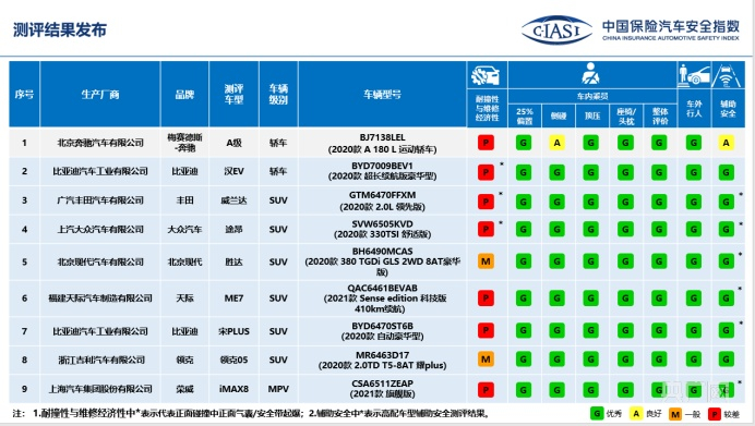 央广网北京6月9日消息(记者 多玛)在中国保险行业协会的指导下,在中保研汽车技术研究院有限公司和中国汽车工程研究院股份有限公司的支持下,2021年6月9日,中保研汽车技术研究试验中心(北京)有限公司(以下简称“试验中心”)在京召开发布会,发布了C-IASI九款车型测评结果,其中2款轿车、6款SUV及1款MPV。涉及车型分别为北京奔驰A级、比亚迪汉、丰田威兰达、上汽大众途昂、北京现代胜达、天际ME7、比亚迪宋PLUS、吉利领克05、上汽乘用车荣威iMAX8,测评工作按照《中国保险汽车安全指数规程(C-IASI 2017版)》实施。