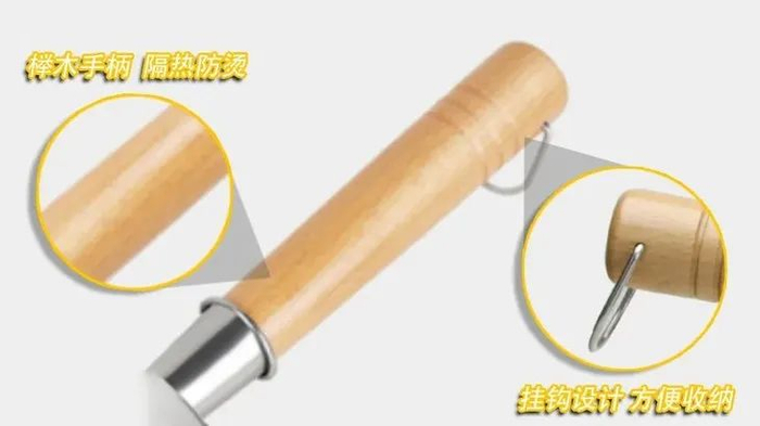 手柄采用了有质感的榉木,打磨的很光滑,还在尾部添加了挂环,不用的时候挂起来,一点都不占地方。