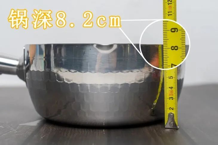这口锅挺小一只,还挺深。我们拿出尺子测了一下,发现他竟然深8.2cm。