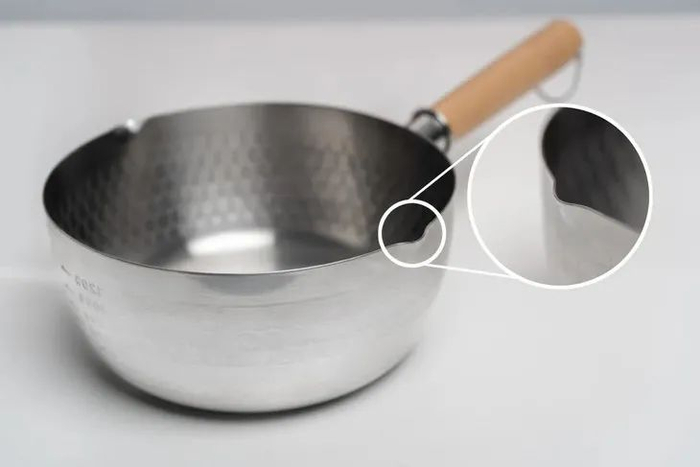锅的两侧还各有一个导流槽,倾倒的时候,液体就顺着导流槽流到杯子里了,而锅身依然干干净净。