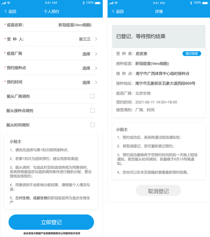 完成个人信息登记,并满足第二剂次疫苗预约条件的群众,可在“个人预约”页面,登记意向接种的接种点、接种时间及疫苗厂商,并可选择是否服从调剂,完成预约接种登记后,等待系统的随机分配结果。
