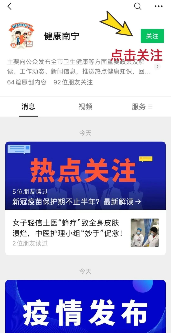 除了以上的微信扫码“健康南宁”“爱南宁”公众号或扫码下载“爱南宁”APP进行预约外,还有一个预约方式:关注“健康南宁”公众号后,在菜单栏点击“网上办事”→“疫苗2剂预约”进入预约系统。