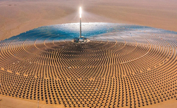 位于甘肃敦煌的首航高科敦煌100兆瓦熔盐塔式光热电站,近万面定日镜将太阳光反射、聚集到集热塔顶部,如一柱擎天火炬闪耀在戈壁滩上。邱新生摄(中经视觉)