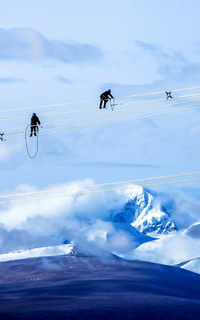 西藏日喀则珠峰保护区,国家电网升级改造工程,两名巡线员正在高空作业。王泗荣摄(中经视觉)