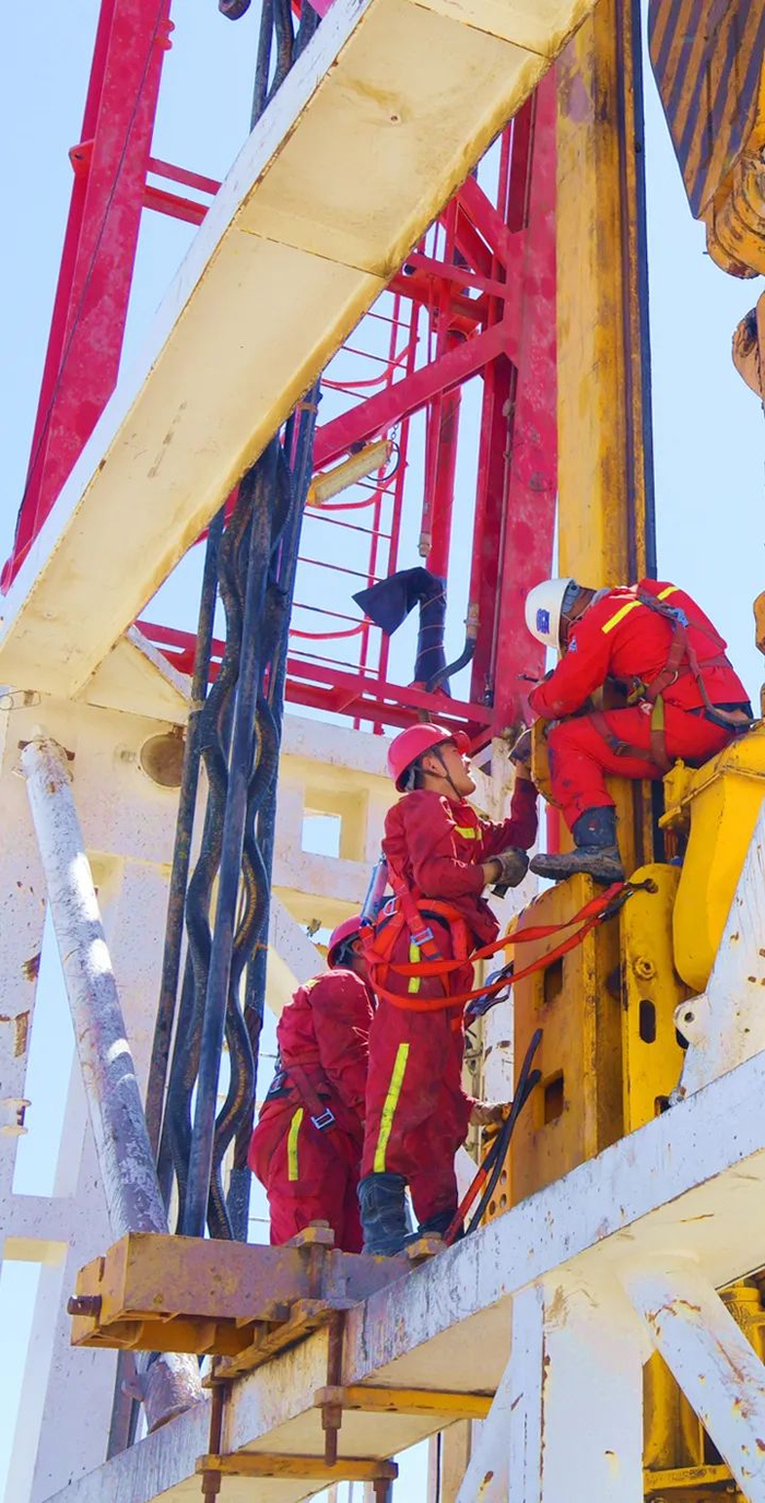 在新疆玛湖油田,西部钻探准东钻井公司70005钻井队员工冒着高温吊装钻探设备。周建玲摄(中经视觉)