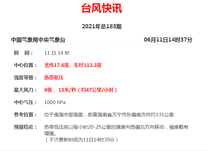 据了解,在南海生成的是个虚胖的热带低压,中心风力不算强,结构松散,覆盖范围较广。端午期间海面将会有6级~7级阵风9级左右大风。海上过往船只、出港渔船和海上作业人员要注意安全,适时回港避风;海岛旅游和水上项目需注意安全。