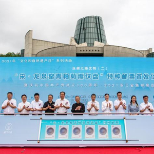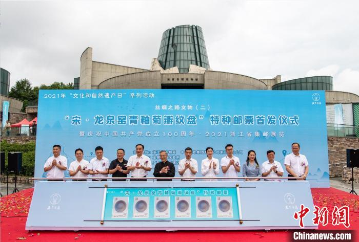 中新网丽水6月12日电(记者 范宇斌)6月12日是“文化和自然遗产日”。当日,“宋·龙泉窑青釉菊瓣纹盘”特种邮票首发暨庆祝中国共产党成立100周年·2021浙江省集邮展览开幕仪式在浙江龙泉举行。
