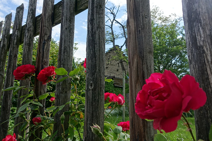 后来我当然很感谢那一闪念的决定,这让深一脚浅一脚来到古堡背后的我得以从更好的角度看清了整座建筑,还遇上了木栅栏间钻出的大片鲜艳欲滴的红玫瑰。忍不住伸手摘两朵,一不留神,扎了手指。刺痛袭来的瞬间,刚好来得及想起:身患白血病的里尔克,不正是死于采摘玫瑰时扎破了手指?