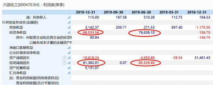 记者还发现,2019年公司单季利润表显示,六国化工的一些非经常性损益项目呈现剧烈变动:比如2019年第二季度突然实现投资净收益7.66亿元;而信用减值损失,又突然出现6.55亿元调回。2019年第四季度,投资净收益又突然出现6.8亿亏损,而信用减值损失又反向计减6.14亿元。