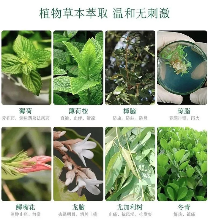 稻穗青草膏足足添加了8种经典植物:薄荷桉、樟脑、鳄嘴花、尤加利、龙脑...…