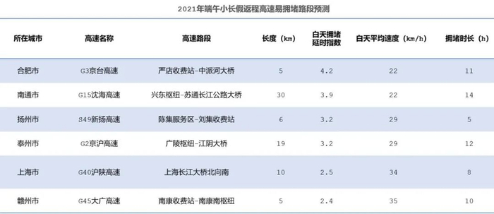 返程中,报告预测6月14日全国高速较易拥堵的路段为G3京台高速合肥段、 G15沈海高速南通段及S49新扬高速扬州段等。