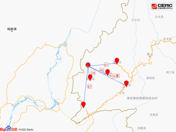 周边县城:震中距盈江县29公里、距梁河县45公里、距腾冲市61公里、距陇川县87公里、距龙陵县91公里,距德宏傣族景颇族自治州92公里,距昆明市486公里。
