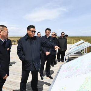 2021年6月7日至9日,中共中央总书记、国家主席、中央军委主席习近平在青海考察。这是8日下午,习近平在海北藏族自治州刚察县青海湖仙女湾,了解青海省加强祁连山地区和青海湖生态环境保护等情况。新华社记者 谢环驰 摄