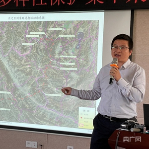 陈飞在发布会上介绍北迁象群迁徙路线(总台央广记者任梦岩 摄)