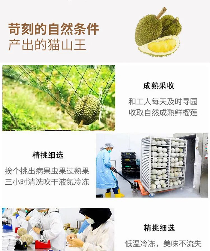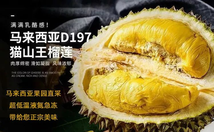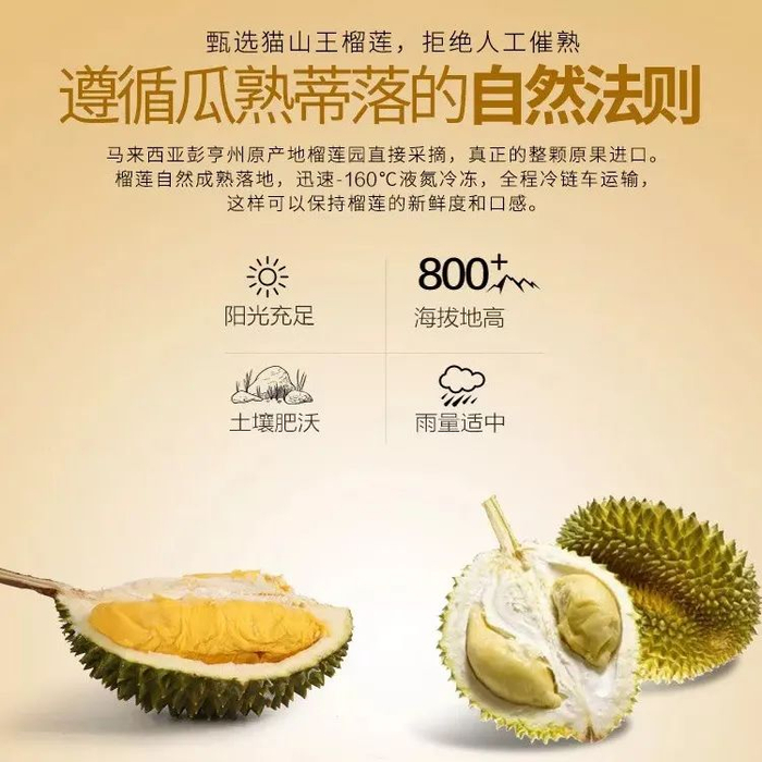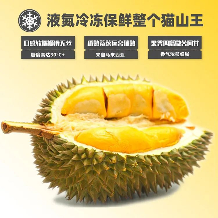 但是这款来自马来西亚的猫山王榴莲,禁止人工催熟,每一颗榴莲都是自然脱落后被采摘,迅速-160°C液氮冷冻。全程冷链运输,以此来保证榴莲的新鲜度和口感!
