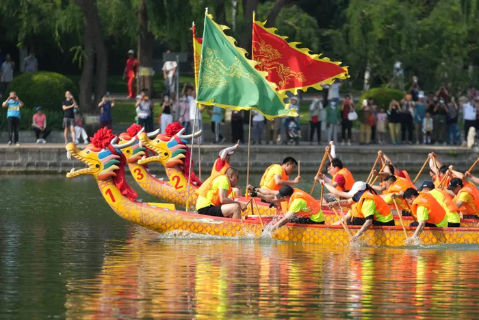 2021年6月12日,北京龙潭公园参赛队伍参加竞速龙舟赛。鞠焕宗摄(新华社)