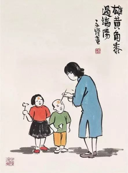 端午节有雄黄涂抹小儿额头的习俗,认为可驱避毒虫。典型的方法是用雄黄酒在小儿额头画“王”字,一借雄黄以驱毒,二借猛虎(“王”似虎的额纹,又虎为兽中之王,因以代虎)以镇邪。
