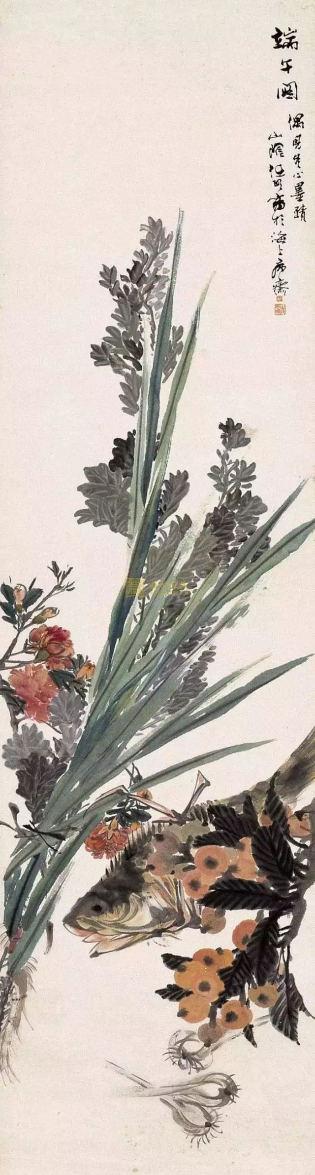 清·郎世宁·《午瑞图》:青瓷瓶内插着蒲草叶、石榴花和蜀葵花,托盘里盛有李子和樱桃,几个粽子散落一旁。