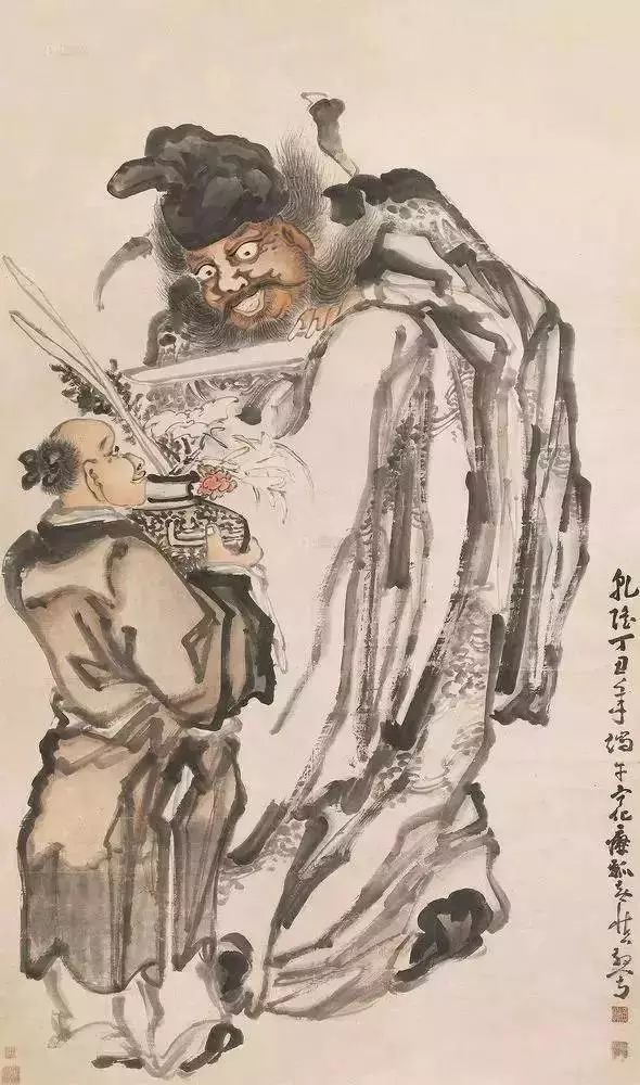 在江淮地区,家家都悬钟馗像,用以镇宅驱邪。钟馗,字正南,是中国传统文化中的“唐·赐福镇宅圣君”。生得豹头环眼,铁面虬鬓,相貌奇异,平素正气浩然,刚直不阿。在中国传统道教中,春节时钟馗是门神,端午时钟馗是斩五毒的天师。