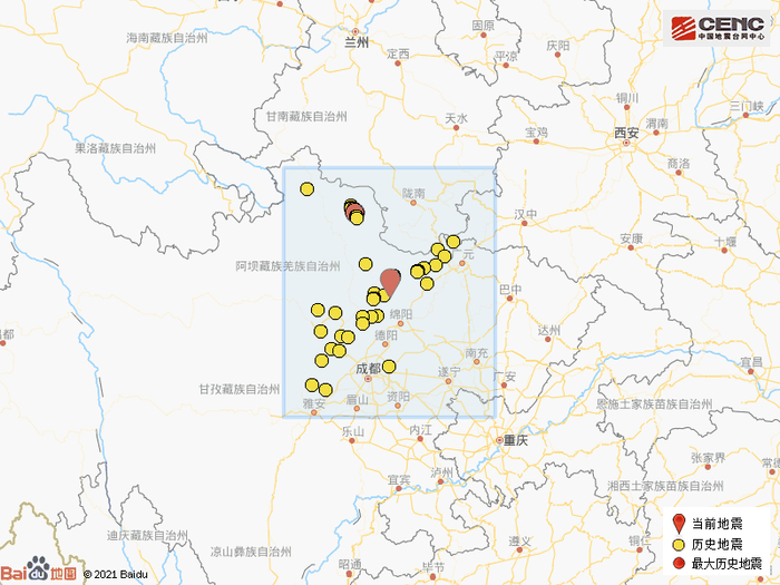 历史地震:根据中国地震台网速报目录,震中周边200公里内近5年来发生3级以上地震共129次,最大地震是2017年8月8日在四川阿坝州九寨沟县发生的7.0级地震(距离本次震中149公里),按震级大小前50次历史地震分布如图。