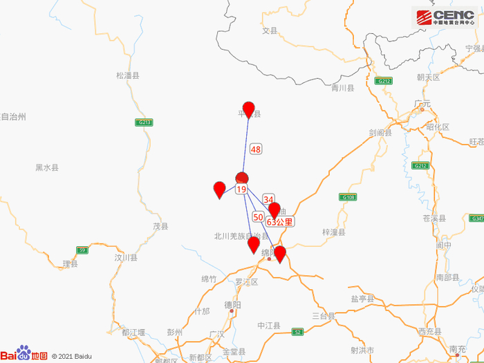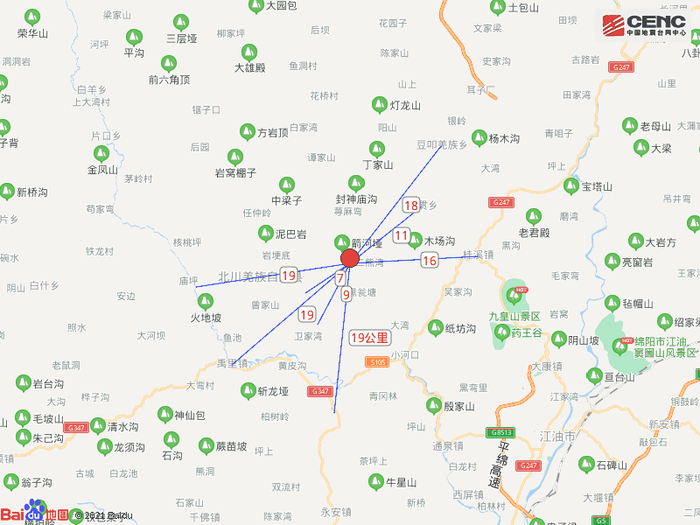 周边县城:震中距北川羌族自治县19公里、距江油市34公里、距平武县48公里、距安州区50公里、距游仙区63公里,距绵阳市60公里,距成都市153公里。