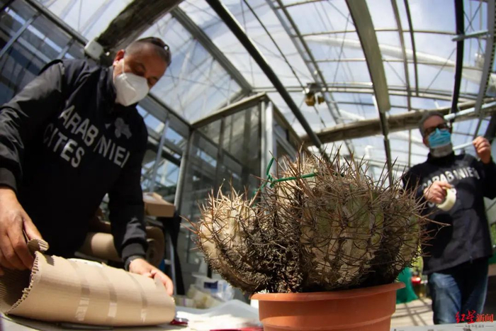 意大利米兰的一名警察打包一株仙人掌,准备寄回智利。图据《纽约时报》