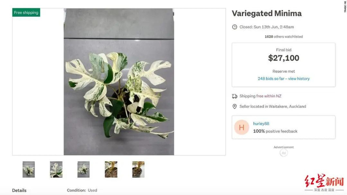 据悉,去年底,这株姬龟背的卖家还在该网站上以6551新西兰元(约合人民币2.99万元)卖出过一株斑纹龟背竹。