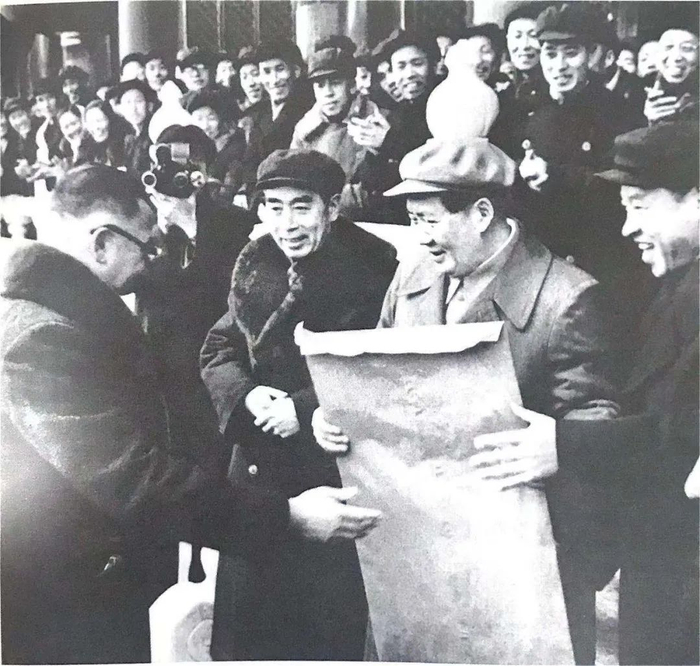 1956年1月15日,在首都各界群众20多万人庆祝社会主义改造胜利大会上,工商界代表向毛泽东呈送喜报。图片来源:《中国共产党简史》