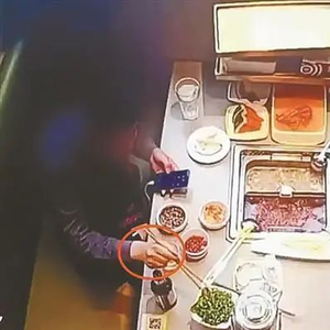 为了不被发现,蔡某先把蟑螂握在手中,再端起一盘青菜。从监控视频中可以看出,由于手中握着异物,蔡某端菜的手显得十分不灵便。期间或许是因为太紧张,蟑螂还不小心掉到桌子上,害怕被发现的他迅速用手机压住蟑螂,再捡起来放在右手手心。在将青菜倒进火锅的过程中,他顺势松手,将蟑螂扔到了火锅里。