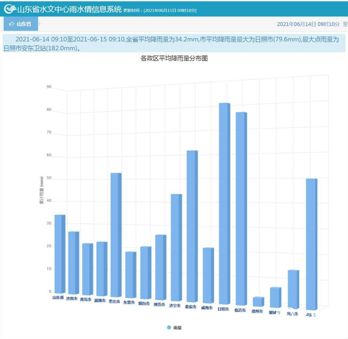 据山东省水文中心,06月14日09:10至06月14日09:10,全省平均降雨量为34.2mm,市平均降雨量最大为日照市(79.6mm),最大点雨量为日照市安东卫站(182.0mm)。