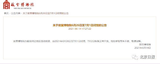 故宫博物院14日发布公告称,为配合周边地区活动需要,将于2021年6月26日至7月1日闭馆,7月2日恢复正常开放。