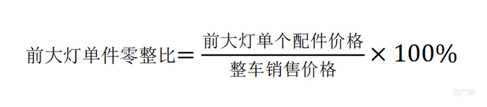 前大灯单件零整比是前大灯单件价格和与整车销售价格的比值。其计算公式为: