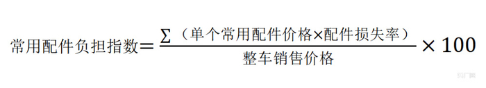 常用配件负担指数就是18项单个常用配件价格乘上配件自身损失率的之和,再除以整车销售价格的比值。其计算公式为: