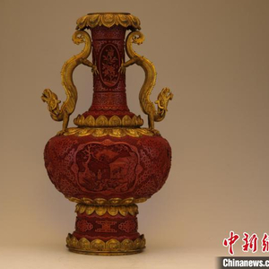 沈阳故宫展出乾隆款剔红开光山水人物纹龙耳瓶