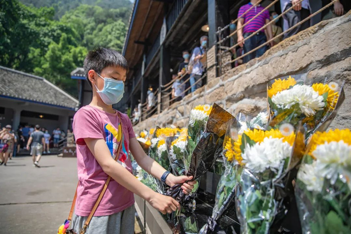 2021年5月1日,在重庆渣滓洞看守所旧址景区,一名游客为烈士献花。黄伟摄(新华社)