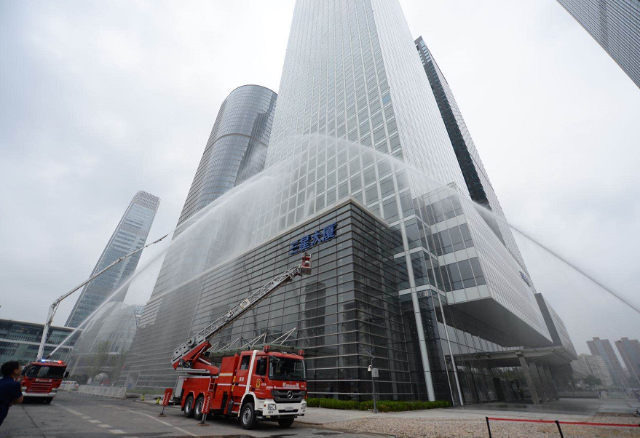 原标题:CBD超高层楼宇消防演练,水炮、高空救援车亮相