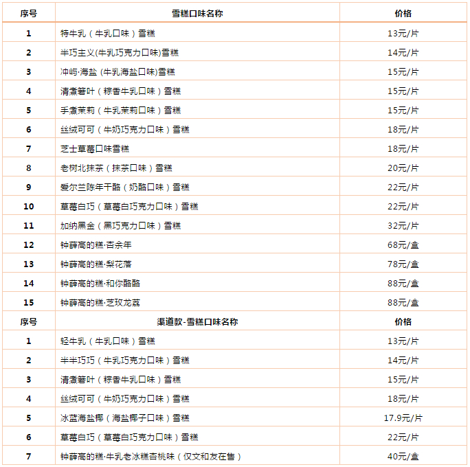 以钟薛高丝绒可可口味和特牛乳口味为例,618期间,钟薛高旗舰店10片丝绒可可活动价格为162元,折合每片16.2元,5片特牛乳加5片丝绒可可活动价格为139元,特牛乳折合每片11.6元,纵观平常时期与其他平台,二者间的价格差基本也都在5元左右。