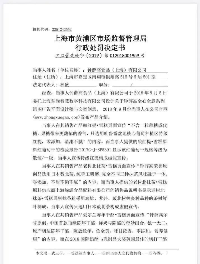 国家企业信用信息公示系统显示,2019年,钟薛高两次因发布虚假广告被行政处罚,共计罚款0.9万元,行政处罚书的内容可以说是非常“打脸”了。