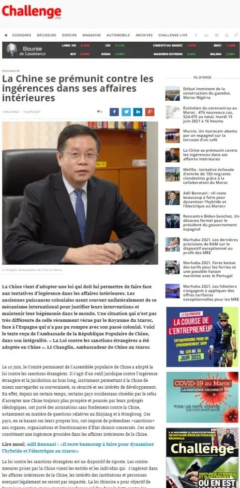 6月14日,驻摩洛哥大使李昌林在摩主流周刊《挑战者周刊》发表题为《中国通过<反外国制裁法>》的署名文章,介绍中国出台《反外国制裁法》的相关背景和考虑。主要内容如下: