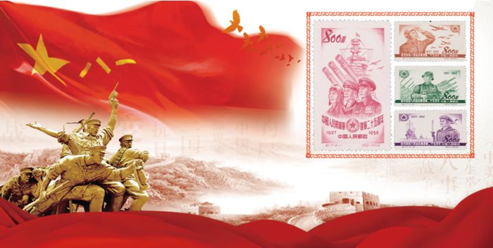 1952年8月1日,中华人民共和国邮电部发行一套由孙传哲先生设计的《中国人民解放军建军二十五周年》纪念邮票,全套4枚。第1枚描绘了海、陆、空三军战士的形象,第2、3、4枚分别描绘了全副武装的陆军、海军、空军战士形象。