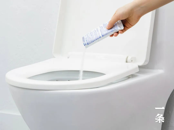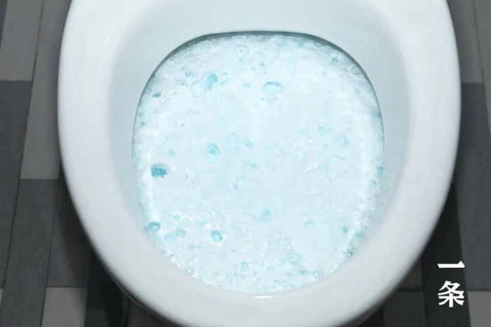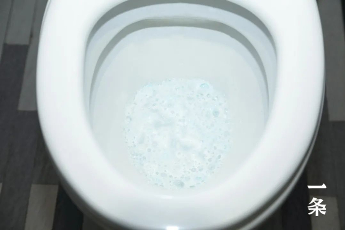 它原本是粉末状的,倒入马桶遇水之后,会瞬间爆发出超多泡泡,迅速填满马桶内部。